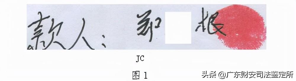 检材《借款协议》是原件,系长宽规格为22.6cm×15.8cm的白色纸张,纸张表面有一横向对折痕迹,保存状况基本正常。需检的“郑某根”签名字迹位于检材《借款证明》中的借款人处,在“根”字右半部分有一红色指印。经初步观察,发现:“郑某根”签名字迹与“借款人”三字的排列位置、字体大小、笔画粗细存有异常,且“郑某根”签名字迹反映出来的书写水平中等,书写速度中等,部分笔画存有连笔趋势,似有快慢变化,但却缺乏笔画轻重的表现,与检材纸张背面明显的笔压凸起痕迹产生矛盾。需检的“郑某根”签名字迹的形成方式异常。如图1所示