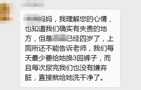 老师看到小琪妈妈的话,也立即解释到“不好意思,这次是我们疏忽,没注意到孩子裤子湿了,平时孩子裤子一天湿三四回,我们没有嫌弃每次都更换下来,而且都洗干净再晾干的。”“快到放学的时候才没注意到,因为放学的时候老师要做的事情太多了,实在抱歉。”