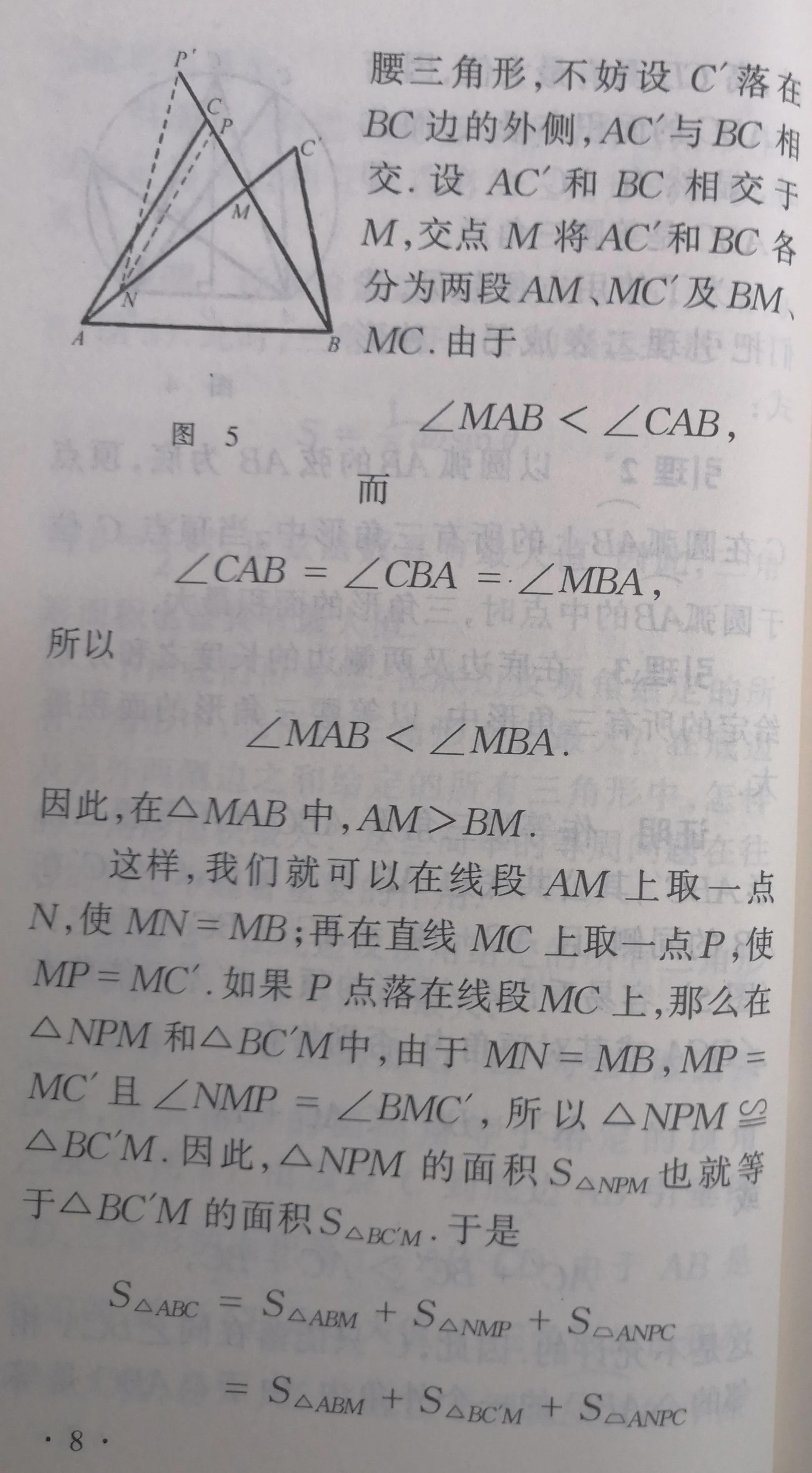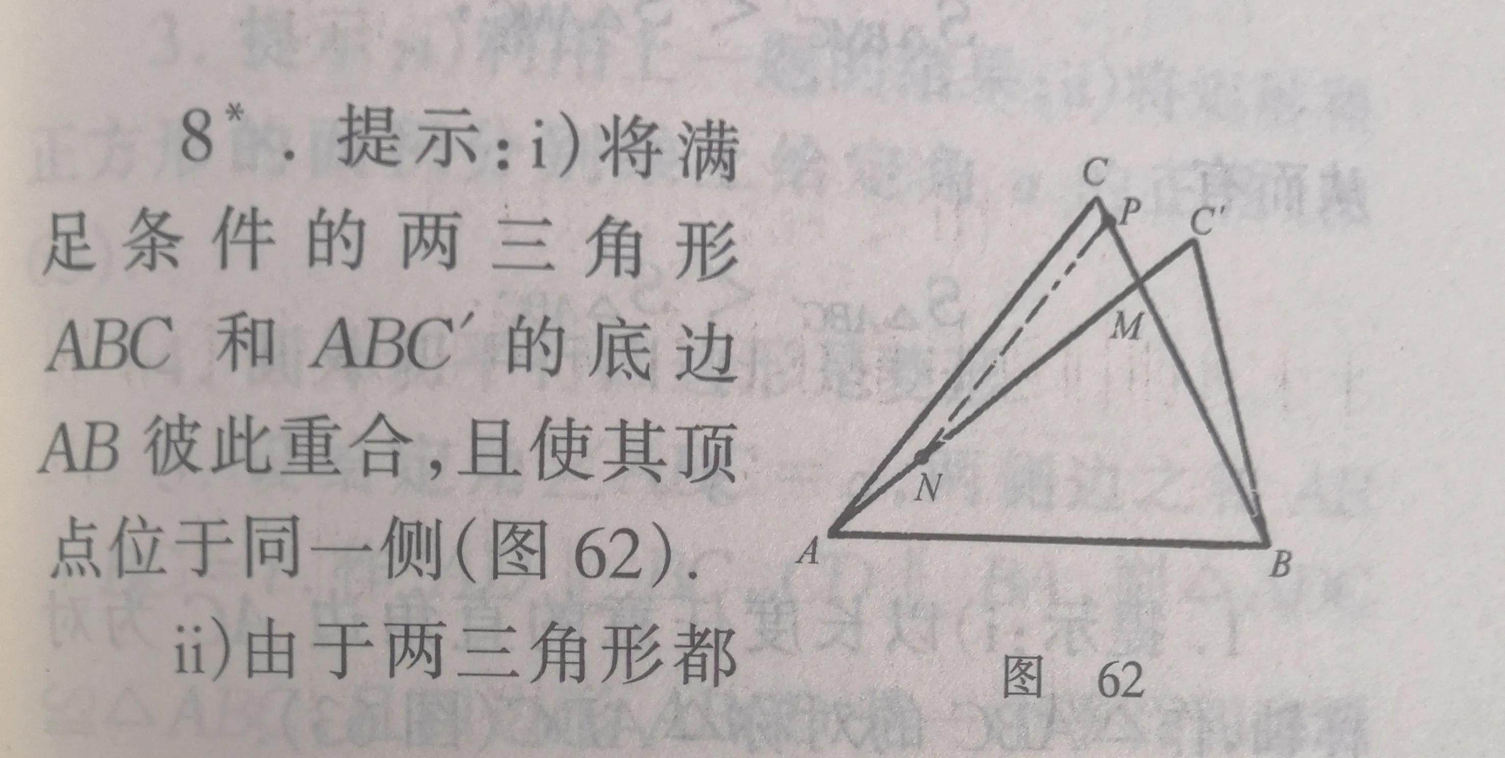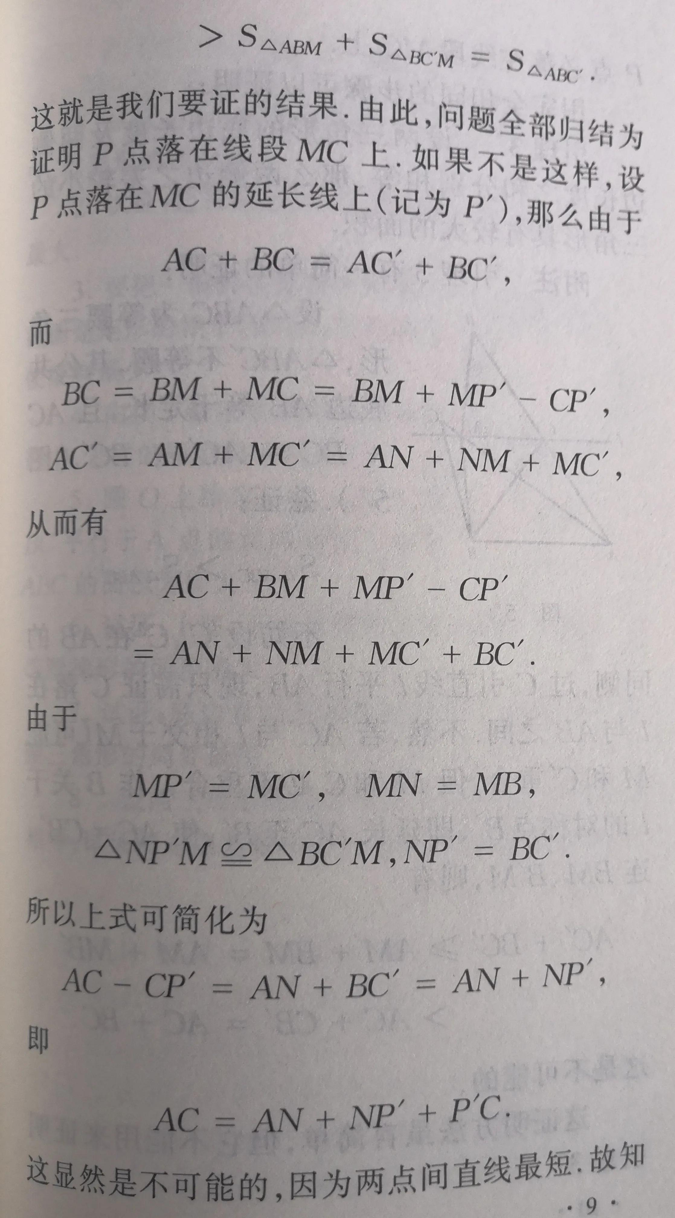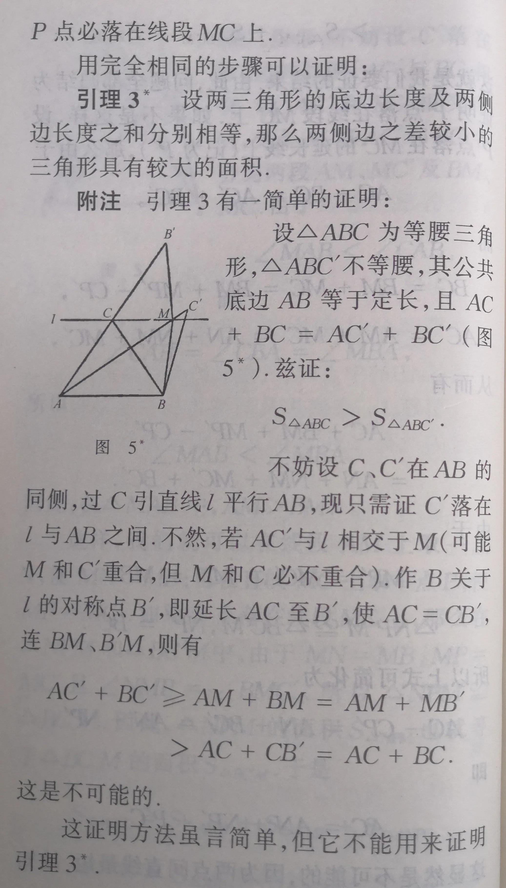 念完全书,在方法上即解题技巧上应该有这么一个印象:这本册子一直在使用反射法——求作关于直线或平面的对称点或对称图形的方法.在第2节引理3的简单证明中“作B关于直线l的对称点B'”,在第5节定理2的证明中,特别在圆和球的极值性质这两节中,都使用着反射法.这种反射法在求解某些几何问题和其他极值问题时,也很有用处.在物理的光学和电磁学里也很有用处,物理学家们称它为镜像法.