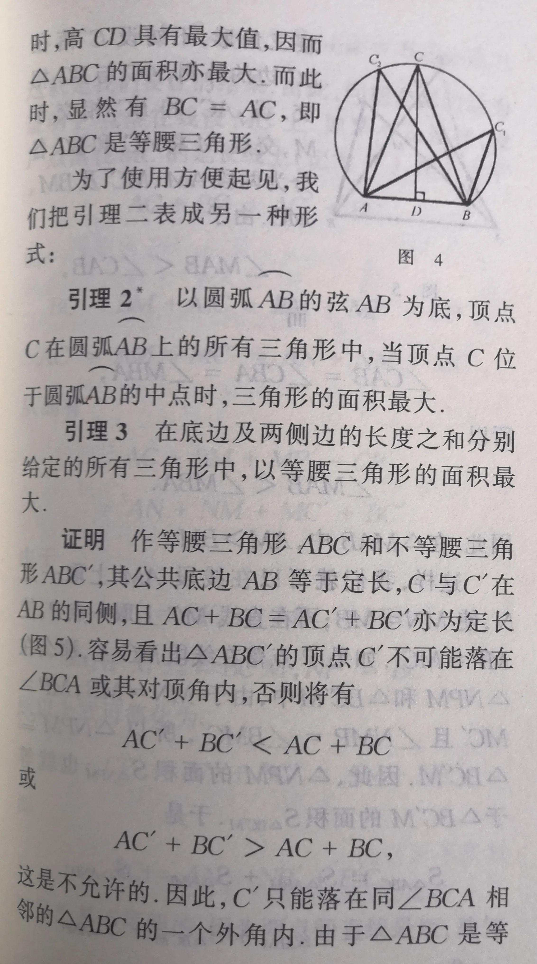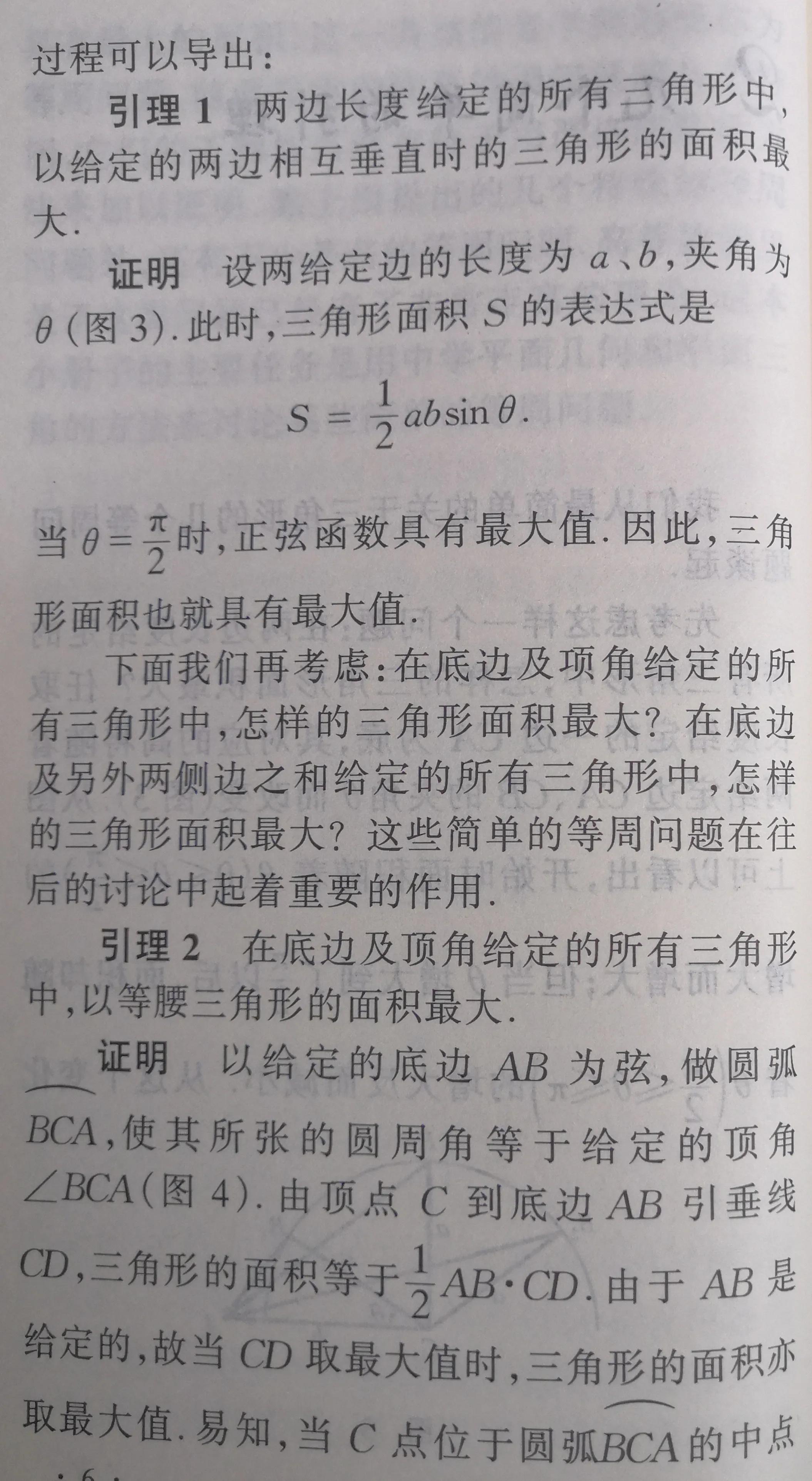 念完全书,在结论上,即定理内容上应该有这么一个印象:达到极值的几何图形往往都具有对称性.比如:内接同一圆周的所有n边形中,正n边形的面积最大;周长为给定值的一切n边形中,正n边形的面积最大;周长一定的所有封闭平面曲线中,圆周所围的面积最大.正n边形是对称性很强的几何图形.至于圆周那是对称性最强的几何图形.通过圆心的任何直线都是它的对称轴,圆心是它的对称中心.深思一下可以发现:“达到极值的几何图形往往都具有对称性”在第2节的引理2和引理3中就已显示出来.