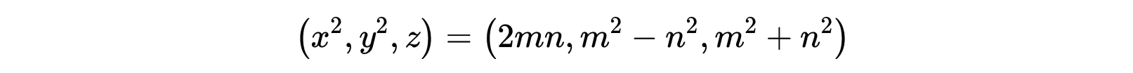 我们现在要证明所有满足式3的三元组都由式4给出。我们首先假定(x, y, z)是一个本原三元组,这意味着它们没有公因数,而y是偶数。这意味着y^2的两个因子:
