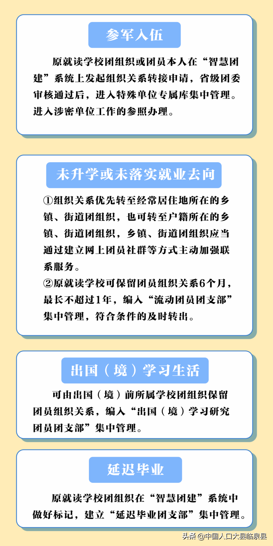 答:对组织关系转至居住地、户籍地所在乡镇、街道的毕业学生团员,乡镇、街道团组织应当主动加强联系服务,持续关注其就业动向,及时跟进做好组织关系转接。