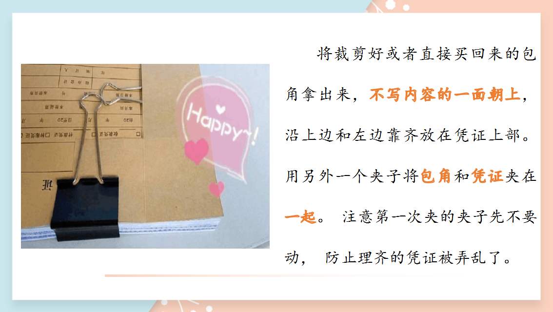 上面的图片,大家更喜欢哪种装订呢?我想大多会选择后者吧!看起来整洁、清晰还美观。下面就来看一下是这样的凭证是怎么装订的吧!