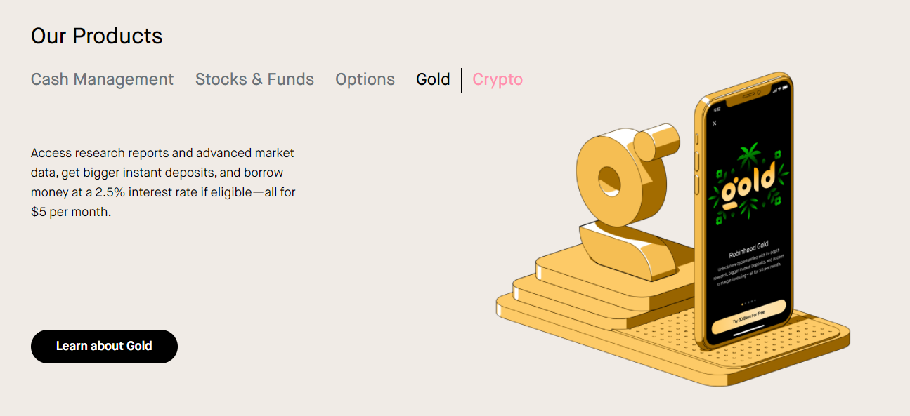 从客户的保证金账户中获得年化5%的证券利息收入;从客户未投资的现金余额中获取累计利息;以及一些融资融券业务;3.4 Robinhood Gold 订阅服务