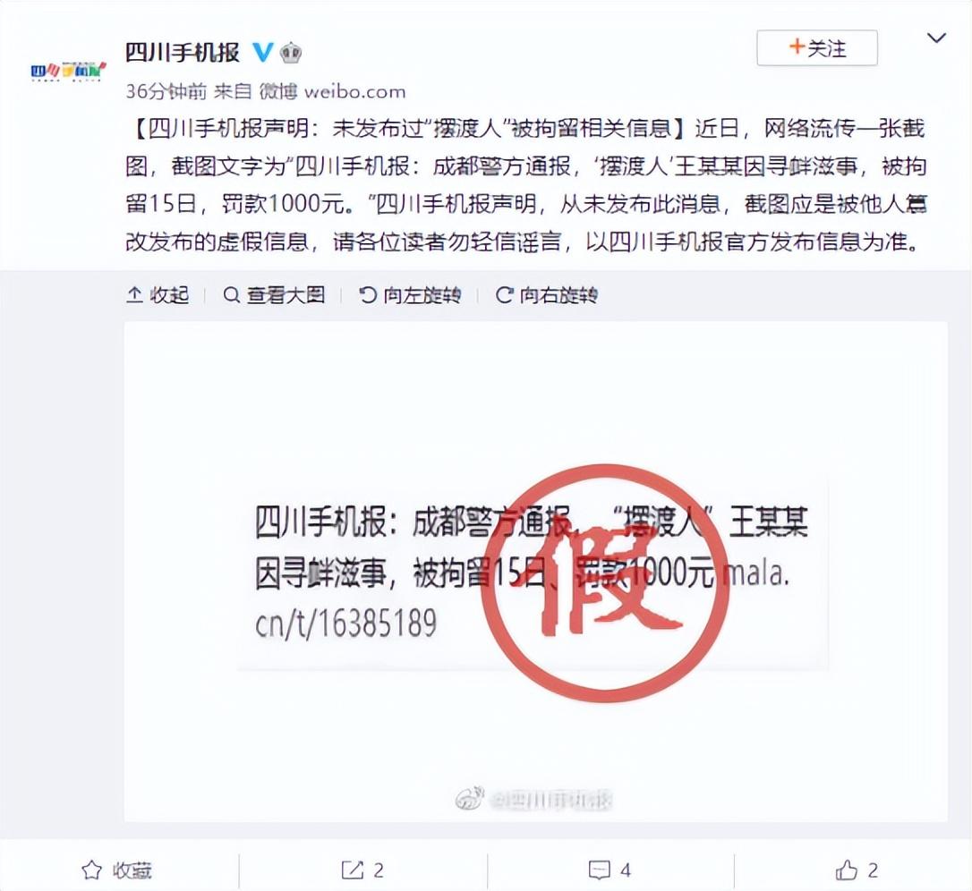 四川手机报声明:未发布过“摆渡人”被拘留相关信息
