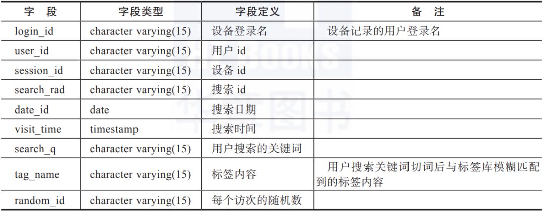 搜索日志表(见表1-7)存放用户在App端搜索相关的日志数据。