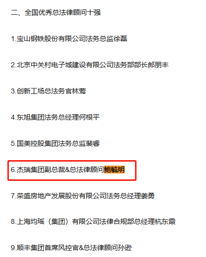 不过,杰瑞股份的高管资料中,并未鲍毓明的姓名。但在2019年11月,在公司法务研究院发布的《CACC第二届全国优秀法务评选揭晓》一文中,鲍毓明作为杰瑞集团副总裁兼总法律顾问,被评为全国优秀总法律顾问10强。