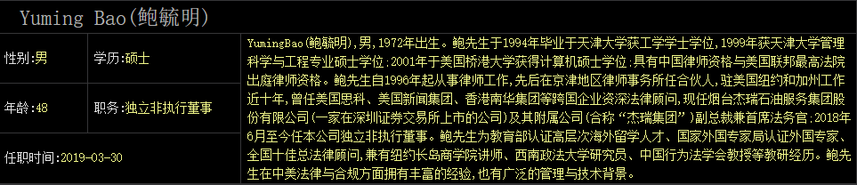 资料显示,鲍毓明自1996年起,从事律师工作,先后在京津地区律师事务所任合伙人,驻美国纽约和加州工作近十年。曾任美国思科、美国新闻集团、香港南华集团等跨国企业资深法律顾问,现任烟台杰瑞石油服务集团股份有限公司及其附属公司(合称“杰瑞集团”)副总裁兼首席法务官。2018年6月至今,鲍毓明任中兴通讯独立非执行董事。