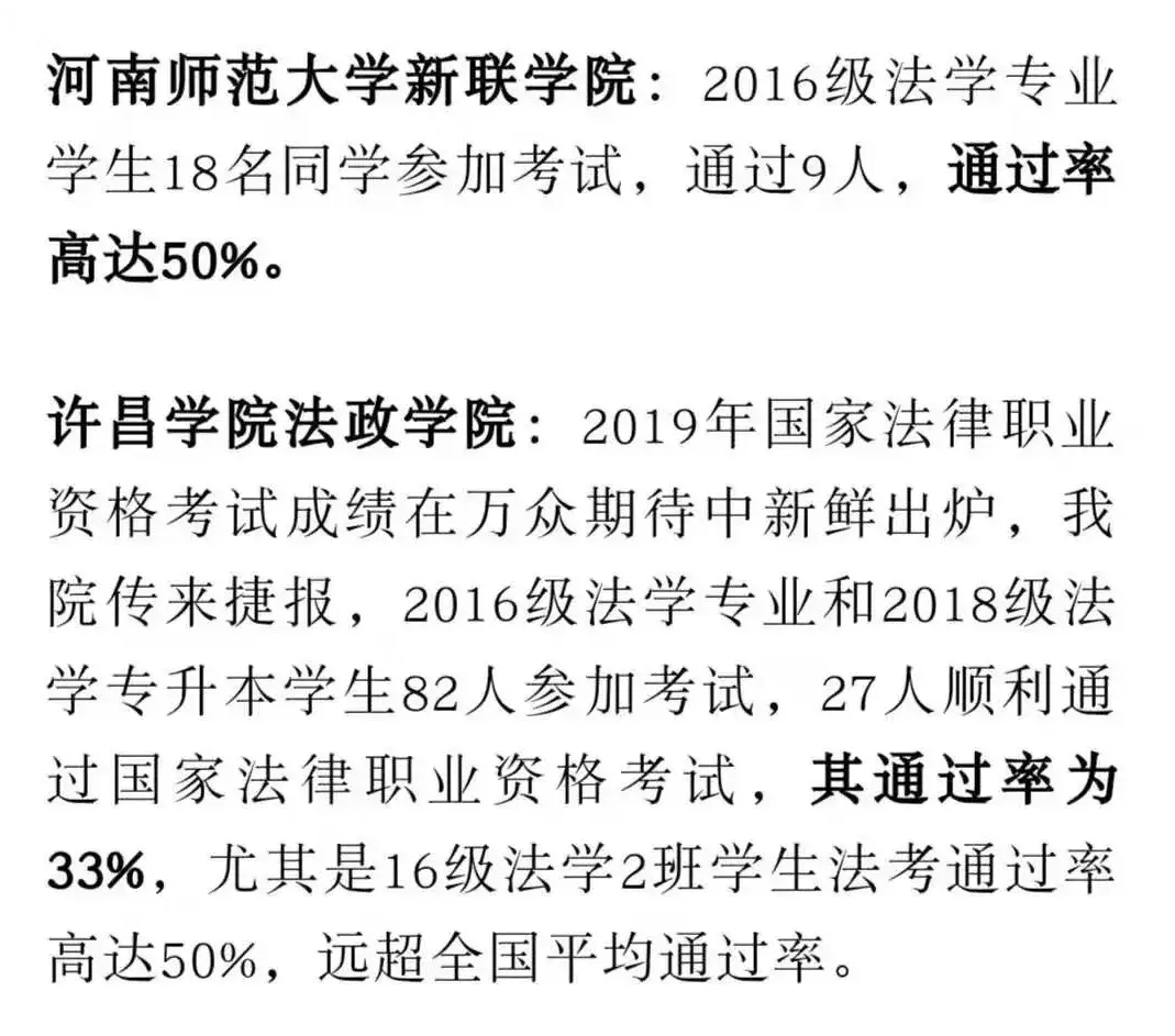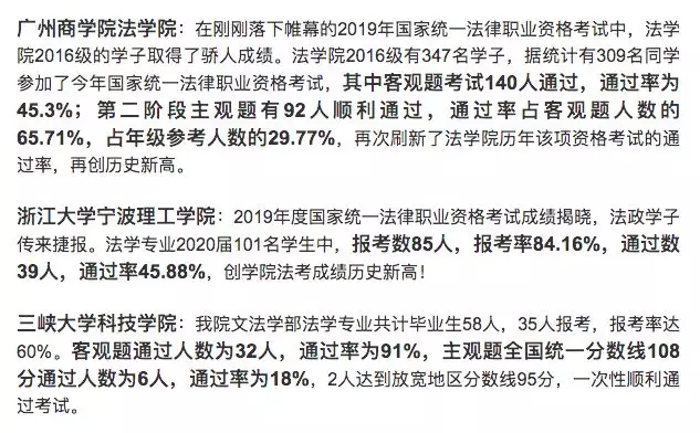 2019年法考结束后,有部分民办学校或独立学院公布了法考通过率,相当多的民办学校的法考通过率远远超过了法考不到20%的通过率,而且通过率还在不断提高: