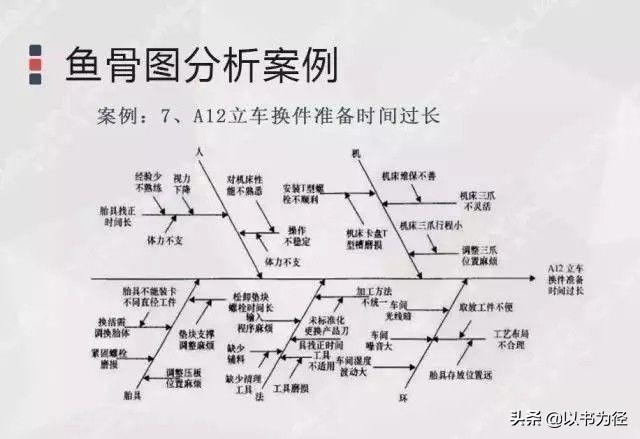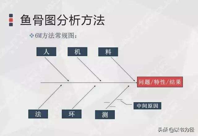 在工作上最常见的就是质量管理方面的问题的,涉及到产品质量的问题,基本都会通过这样的分析方法找出具体的解决措施,从根源上把问题消灭。最明显的就是我们常用的QC七大手法中的因果分析图,也称鱼骨图,通过鱼骨图就非常明显把各种因素罗列出来。而在罗列的过程中,我们就使用了“MECE分析法”。