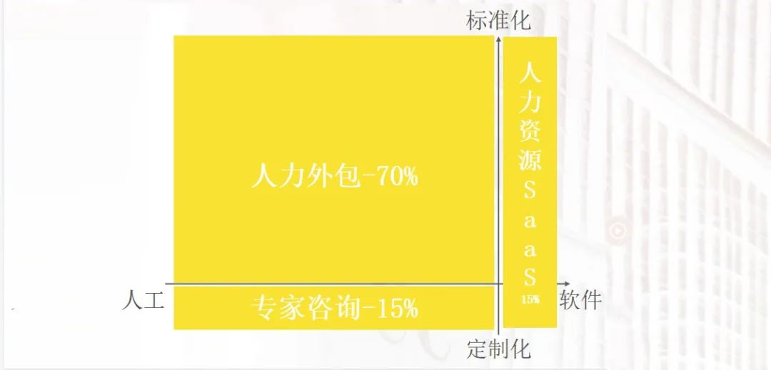 人力资源服务领域的业务其实是以服务为主,软件为辅。拿中国的人力资源市场来讲,比如中智、FESCO 这样的人力外包大概占了 70% 左右的市场,还有大家熟知的北森、易路、Moka,这类人力资源 SaaS 占得市场蛋糕其实并不多。而在欧美,人力资源 SaaS 其实占的份额很高。