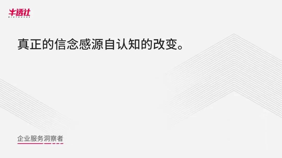 文化上,也就是我们前面讲到的信念,其实真正转型变革时,如果连企业信念也发生改变,那变革也没有太大意义,但实际上每一个创业者需要有信念感,这个信念指的不是利润,而是认知改变。