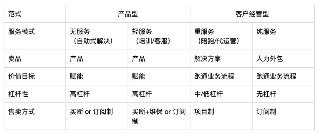 从提供服务看,产品型范式就是单纯卖产品,但客户经营型卖的是解决方案和人力外包服务;从价值目标看,产品型范式更偏向 To B 产品,偏向赋能,比如使用数据库后拥有更大的能力,至于能力如何使用,还是要因人而异;但客户经营型范式不偏重于赋能,而是在真正场景中运用,跑通业务流程。