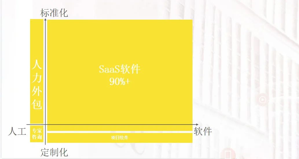 对 SaaS 软件来讲,其实是以软件为主,服务为辅。从早期的标准化 SaaS 产品到产品矩阵,到今天项目软件的定制化,慢慢地从软件走向软件+服务的融合模式。在这个领域,一般来讲,欧美市场大概九成收益都是从 SaaS 软件获取的,剩下的不管人力外包、咨询以及项目软件所占的份额相对较少,但目前在中国来讲,项目软件所占的份额较大。