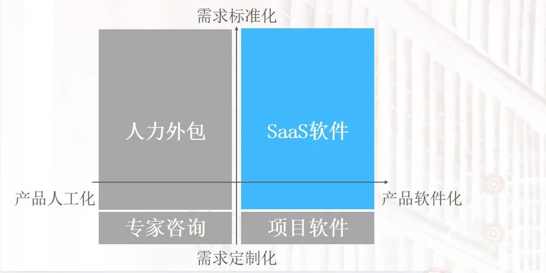 把坐标轴划分一下,我们会发现第一象限是高度标准化和软件化的产品,比如石墨、神策、销售易、北森其实都在这个象限,我们把它称之为 SaaS 软件,SaaS 软件是杠杆很高的业务模式,所以受到了投资人的热捧;第二象限,用人工化方式来满足标准化需求,这是人力外包,这个业务模式没有太多杠杆,主要追求的是效率和规模效应。