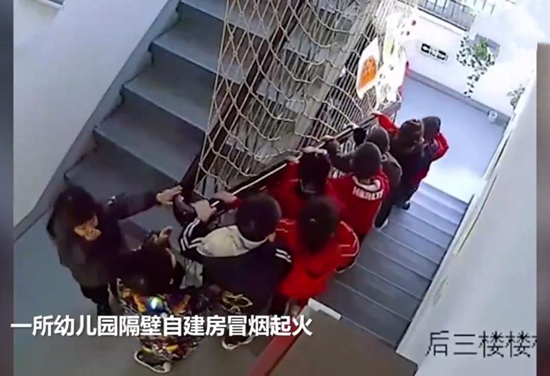 浙江一幼儿园,隔壁的自建房着火,发现有火情后。老师们迅速组织孩子们撤离,没看见孩子们哭泣,也没看见孩子们乱跑。
