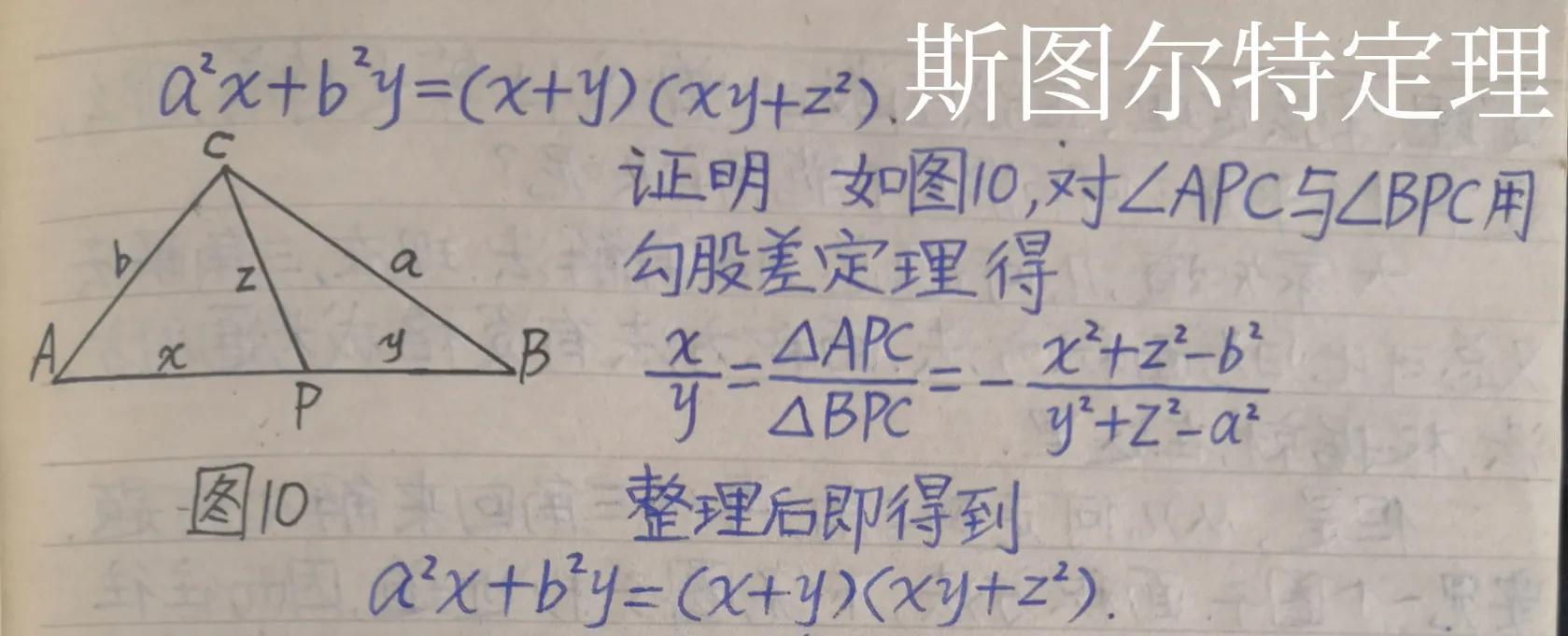 如图10所示,设P是△ABC的AB边上的任一点。记PA=x,PB=y,PC=z,BC=a,AC=b,则有