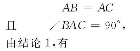 结论2 等腰直角三角形斜边上任意一点到斜边两端点距离的平方和等于它到直角顶点距离平方的2倍.