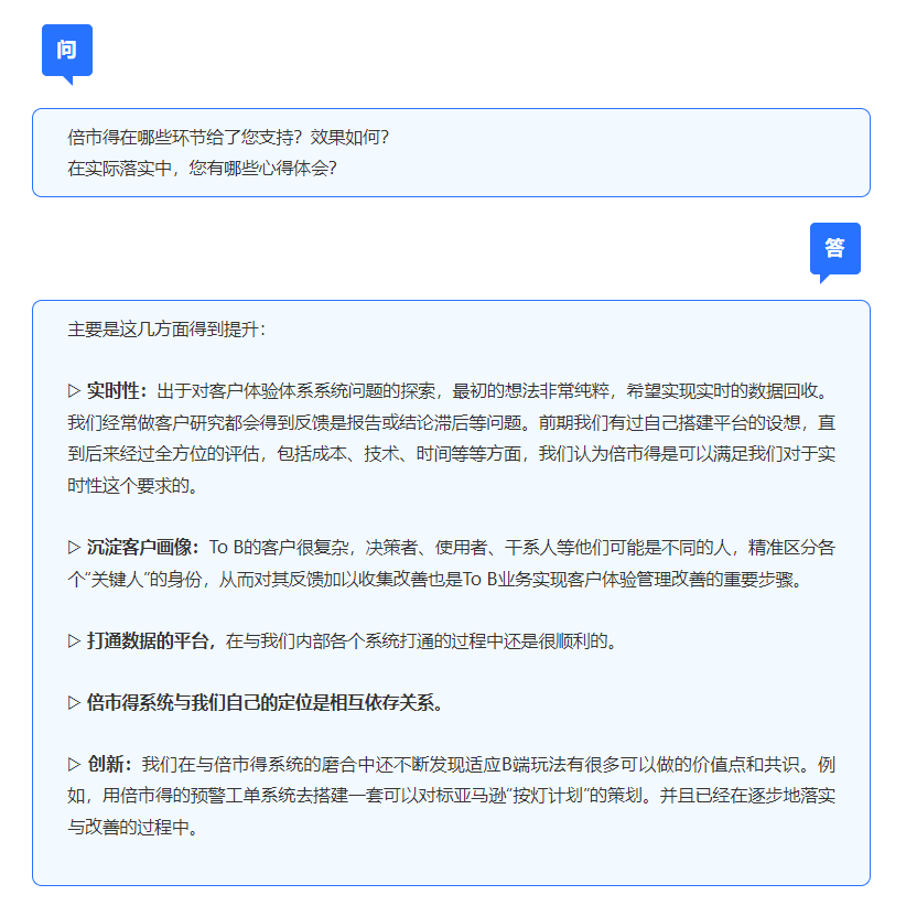 从去年11月开始,企业逐步采用倍市得的客户体验管理系统,也是To B行业落地数字化客户体验管理的一个经典案例。