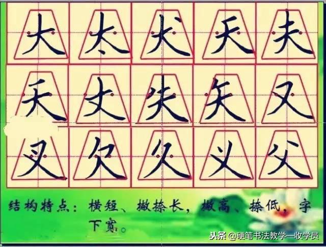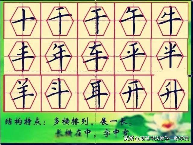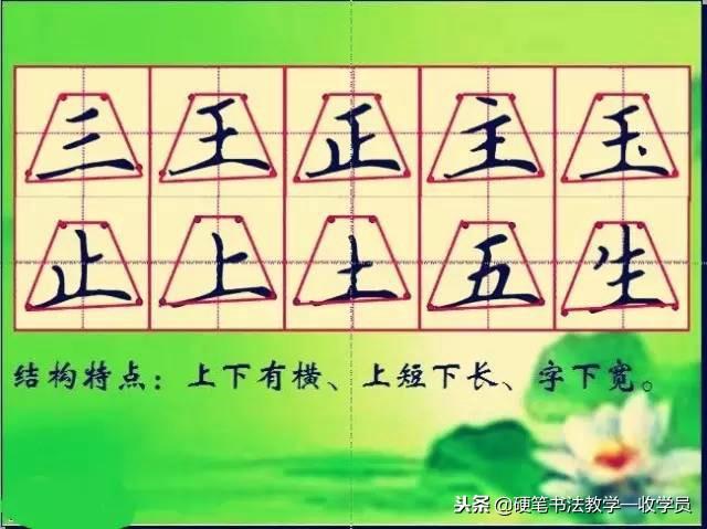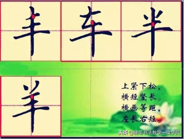 硬笔书法教学:钢笔字书写规律与口诀短横口诀:写短横,不能平,肩稍抬,笔上行。长横口诀:写长横,要看准,零到五度求平稳。1、短横的倾斜度是5-8度左右2、长横的倾斜度是0-5度左右执笔方法口诀:轻松握铅笔,上边一个圆,三指来挤严,四指一条线,手握空心拳。详细讲解:捏:用大拇指和食指。