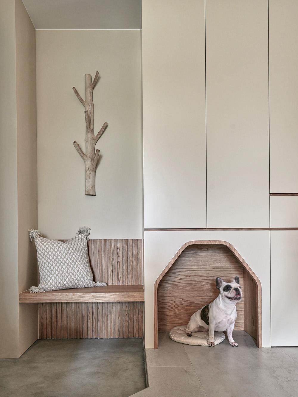 在鞋柜下方,将宠物狗小窝设置于此,透过多角度线条勾勒小天地,当毛孩窝居在此时,家又是另一种可爱风景。