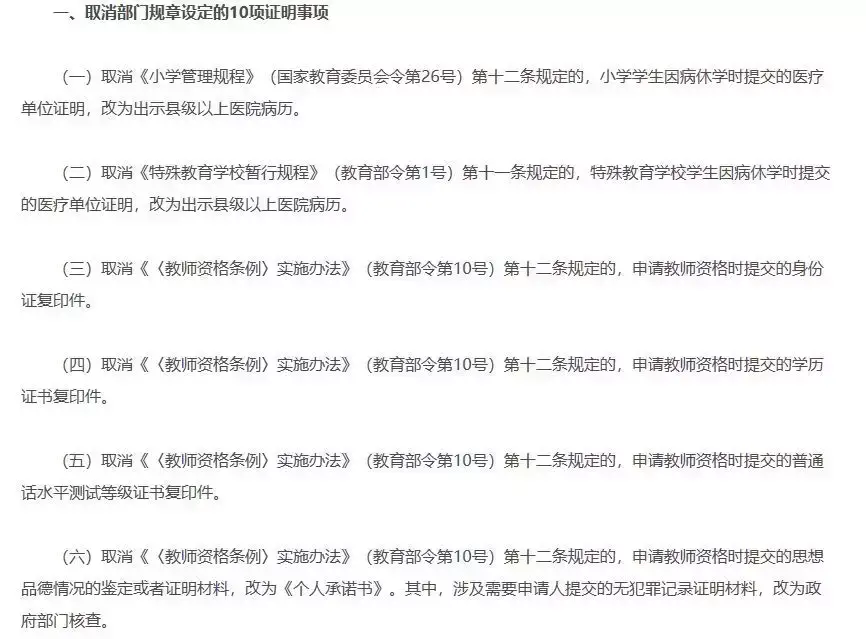 例如,在此次取消部门规章设定的证明事项中,取消了《〈教师资格条例〉实施办法》(教育部令第10号)第十二条规定的,申请教师资格时提交的身份证复印件、学历证书复印件和普通话水平测试等级证书复印件。申请教师资格时提交的思想品德情况的鉴定或者证明材料,改为《个人承诺书》。其中,涉及需要申请人提交的无犯罪记录证明材料,改为政府部门核查。