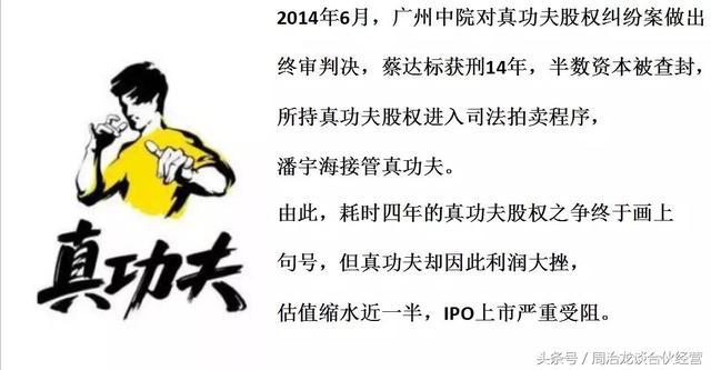 那这件事情就触怒了潘宇峰,要求要回真功夫免费送给蔡达标25%的股份。蔡达标没有还给她。所以潘宇峰诉讼于法律,要求法律强制执行来归还我赠予给他的25%股份。这个时候蔡达标也非常痛苦,前有狼后有虎。什么是前有狼?前面是与他持股比例相当的前小舅子,以后是谁的小舅子也不知道。后面是他的老婆咄咄逼人,要求要回25%的股份,这个时候今日资本、中山联动想要助推真功夫上市,真功夫上市以后1%的股份得到溢价将是天壤之别,那可不是我们大家想象的多给你1%,少给你的1%。那么阿里巴巴马云拥有公司股份8.7%,就获得了215亿美元的财富。这个蔡雄信只拥有百分之三点几的股份就获得了70亿美元的财富,1%上下都是巨大的财富差别。