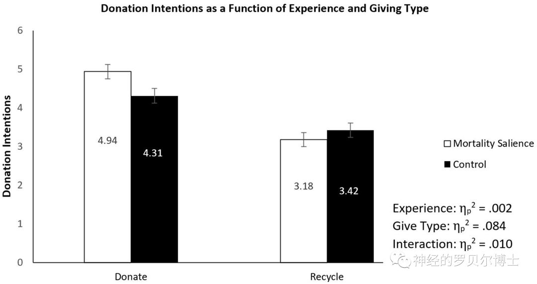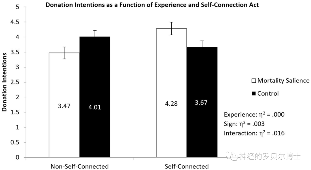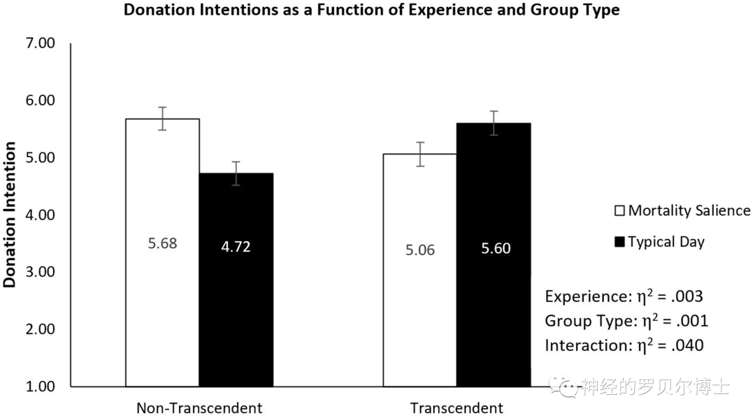 结果发现,当超度感被满足的时候,即当得知自己所在的组织在自己去世后仍然会存在的条件下,被试的捐赠意愿会降低。同时有趣的是,在控制条件下,相比于超度感未被满足的条件,超度感得以满足的被试反而增加了他们的捐赠意向,这可能是因为想象自己身处一个延续的组织之中,会让个体的关注点从自我转向群体。