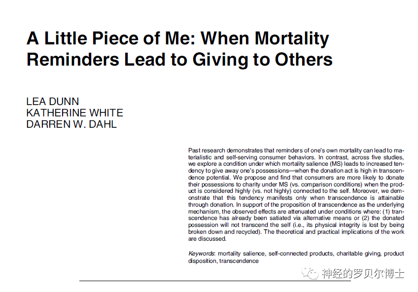 除了上述两种机制之外,Dunn等人提出了一个新的观点,他们认为,超度感也可以用来回避死亡带来的焦虑。超度感是指将自我延伸至实际存在的物体,即使肉身消亡,因为物体仍然存在,也可以达到一种精神永存的状态。Dunn等人想要探究的是,在死亡凸显条件中,在何种情况下人们会更愿意捐赠物品,他们的研究成果于2020年4月22日发布在《Journal of Consumer Research》上,详见文末链接。