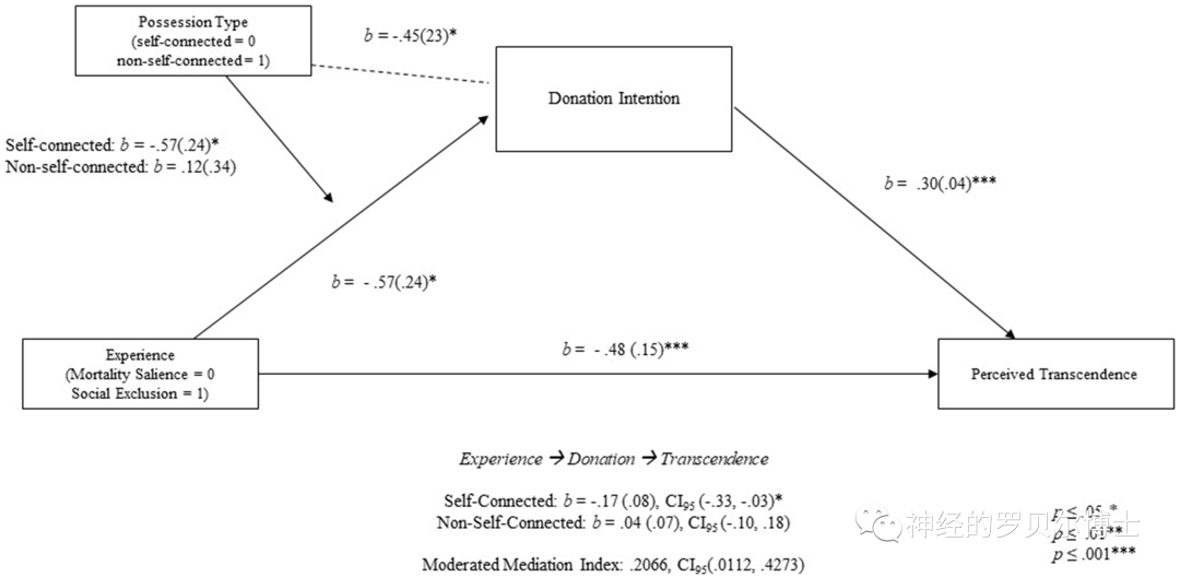 研究者对实验三的数据进行了中介调节分析,模型表明,死亡体验的唤醒会影响被试的捐赠意向,从而影响被试的超度感:当捐赠的物品与被试的自我高度相关时,在死亡提醒下会更愿意捐赠,也会获得更多超度感;而与被试相关性不强时,死亡提醒条件下,被试并不会更愿意捐赠,也并不会获得更多超度感。