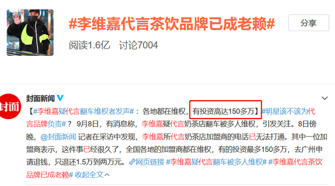 去年李维嘉就因代言某奶茶品牌,被一群身穿“失德艺人”T恤衫的加盟商堵了门。
