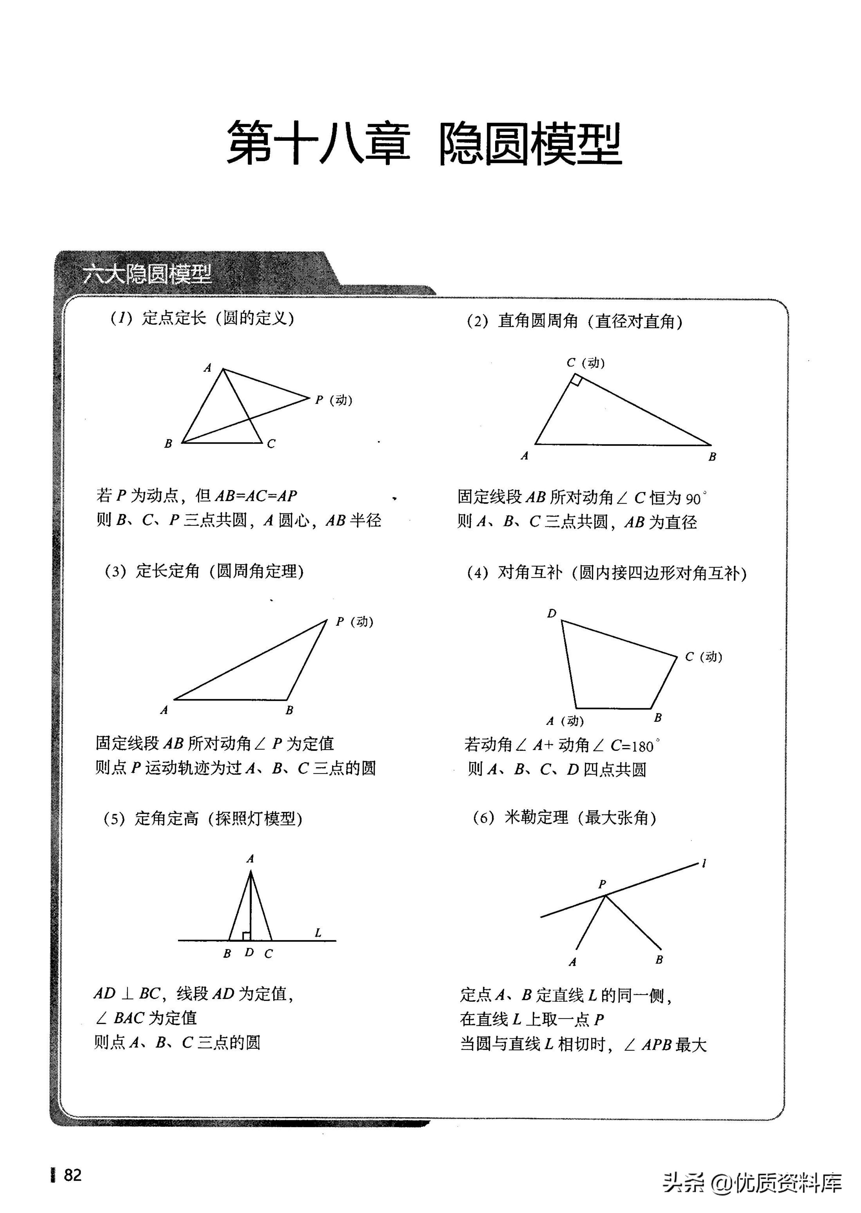 (1)定点定长(圆的定义)(2)直角圆周角(直径对直角)(3)定长定角(圆周角定理)(4)对角互补(圆内接四边形对角互补(5)定角定高(探照灯模型)(6)米勒定理(最大张角)6大隐圆模型