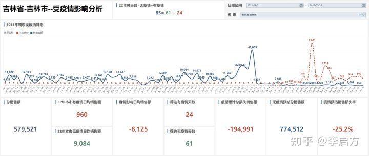 '吉林省'-40%的业绩下滑中,'吉林市'足足-85%的下滑。大家一般都会清楚应该是受到疫情影响。但是这个应该很不会,是怎么个个影响法,具体影响了多少,真的全是疫情的原因?上述的[日常可视化报表]并不能无法证明。