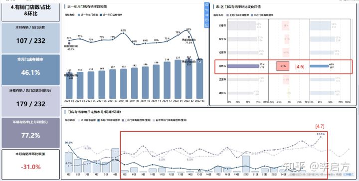 上图 [4.3] 条形图粗细代表[销售额占比],表示对全局的影响度,影响度最高的还是'长春市',不过'长春市'上月的[门店有销量率]本来就偏低,只有69%,环比减少了了-15.5%。 变化最大的依然是'吉林市'从上月很高的77% 减少了-31% 到46% 变化巨大。