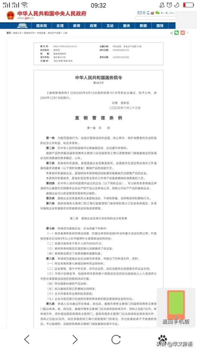 资料图:根据中央政府门户网站官网“国务院令”关于2005年8月23日“直销管理条例(中华人民共和国国务院令第443号)”文件 华文新语 编辑