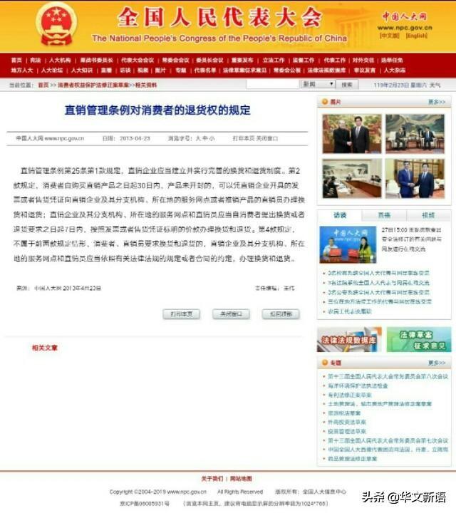 资料图:根据中国人大网官网“相关资料”关于2013年4月23日《直销管理条例对消费者的退货权的规定》文章 华文新语 编辑