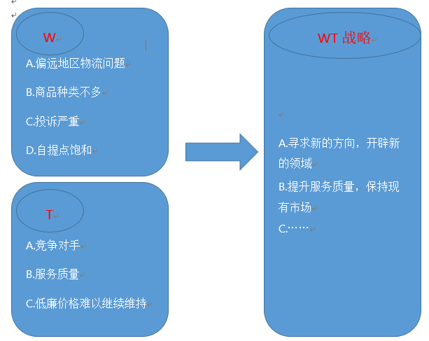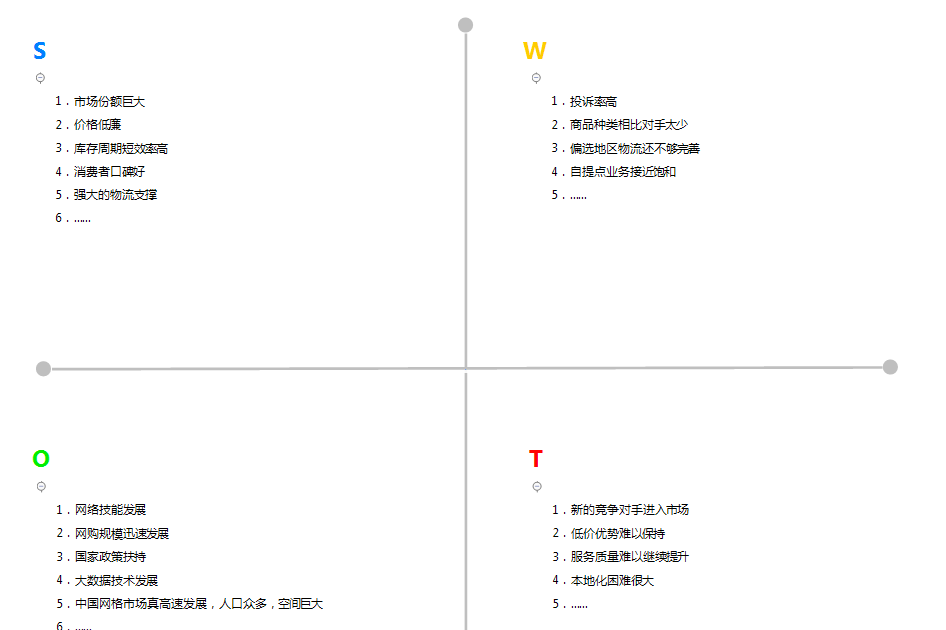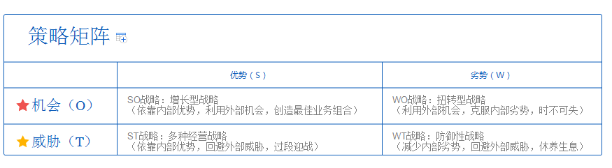 2.各优势、机会、劣势、威胁组合。形成SO、ST、WO、WT策略