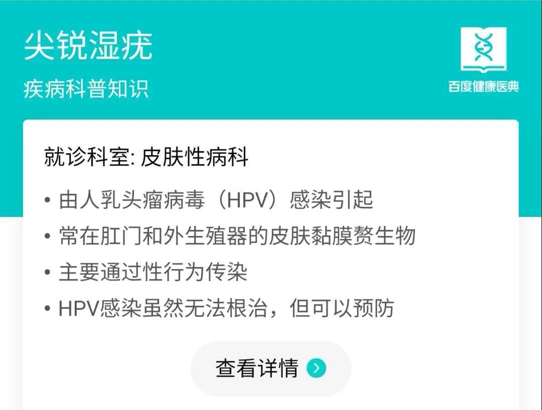 由人乳头瘤病毒(HPV)感染引起,主要通过性行为传染,常发生在肛门和生殖器等部位;主要表现为皮肤黏膜赘生物,大小和形状多变,容易复发,需要长时间反复治疗。