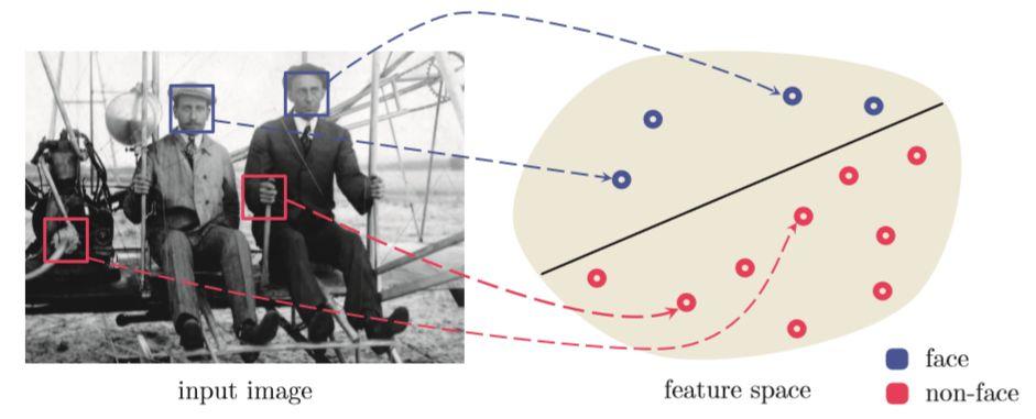 ▲图1-11 为了确定测试图片中是否存在人脸(该示例图片中,飞机的发明者莱特兄弟并排坐在他们于1908年发明的第一个机动飞行器上),一个小窗口扫描了图片的全部区域。在每个位置上,通过检查特征表示位于分类器的哪一侧来确定小框中的内容是否为人脸。作为示例,右图中的直线上方和下方区域分别表示学习分类器的人脸一侧和非人脸一侧