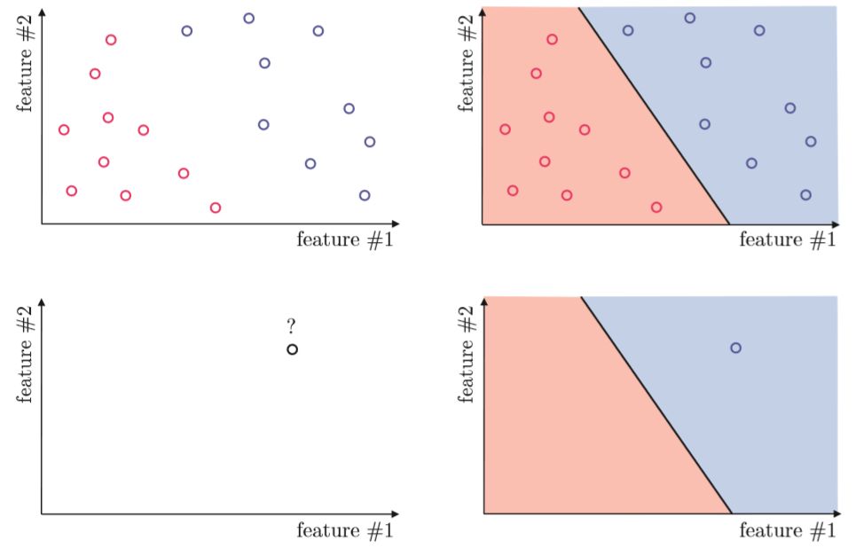 ▲图1-10 (左上图)包含两个不同的类的微型二维训练集;(右上图)一个已经训练好的用来区分这两个类的线性模型;(左下图)一个未知类的测试点;(右下图)测试点被分到相应的类中,因为这个点位于已训练好的线性分类器的右侧