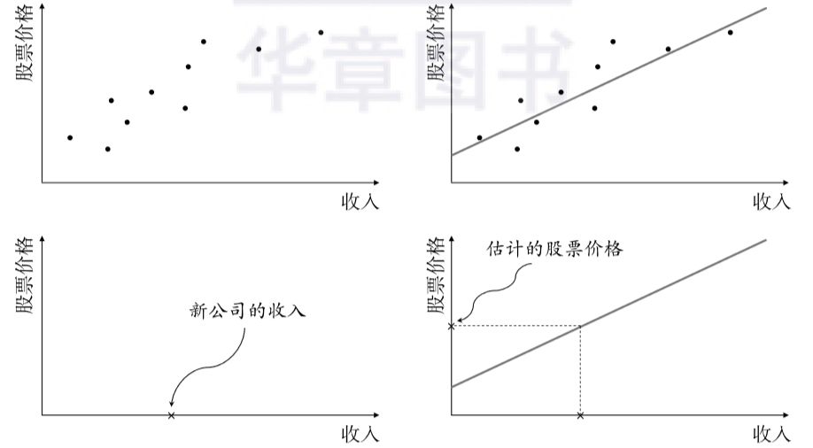 ▲图1-7 (左上图)由10家公司的股价和收入组成的微型训练数据集;(右上图)一个拟合该数据的线性模型;如左下图和右下图所示,这条趋势线可以建模这些点的整体轨迹,并且可以在将来用于预测