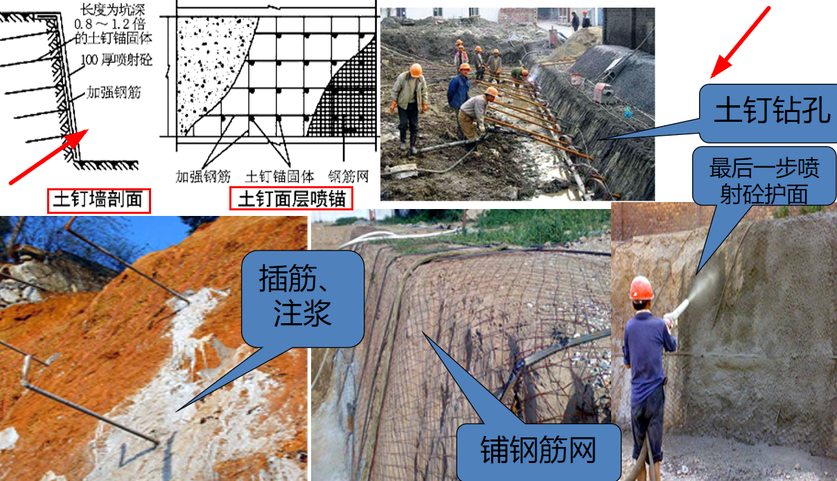 土层锚杆支护:适于较硬土层或破碎岩石中开挖较大较深基坑,邻近有建筑物须保证边坡稳定时采用。