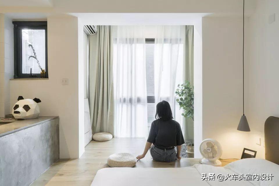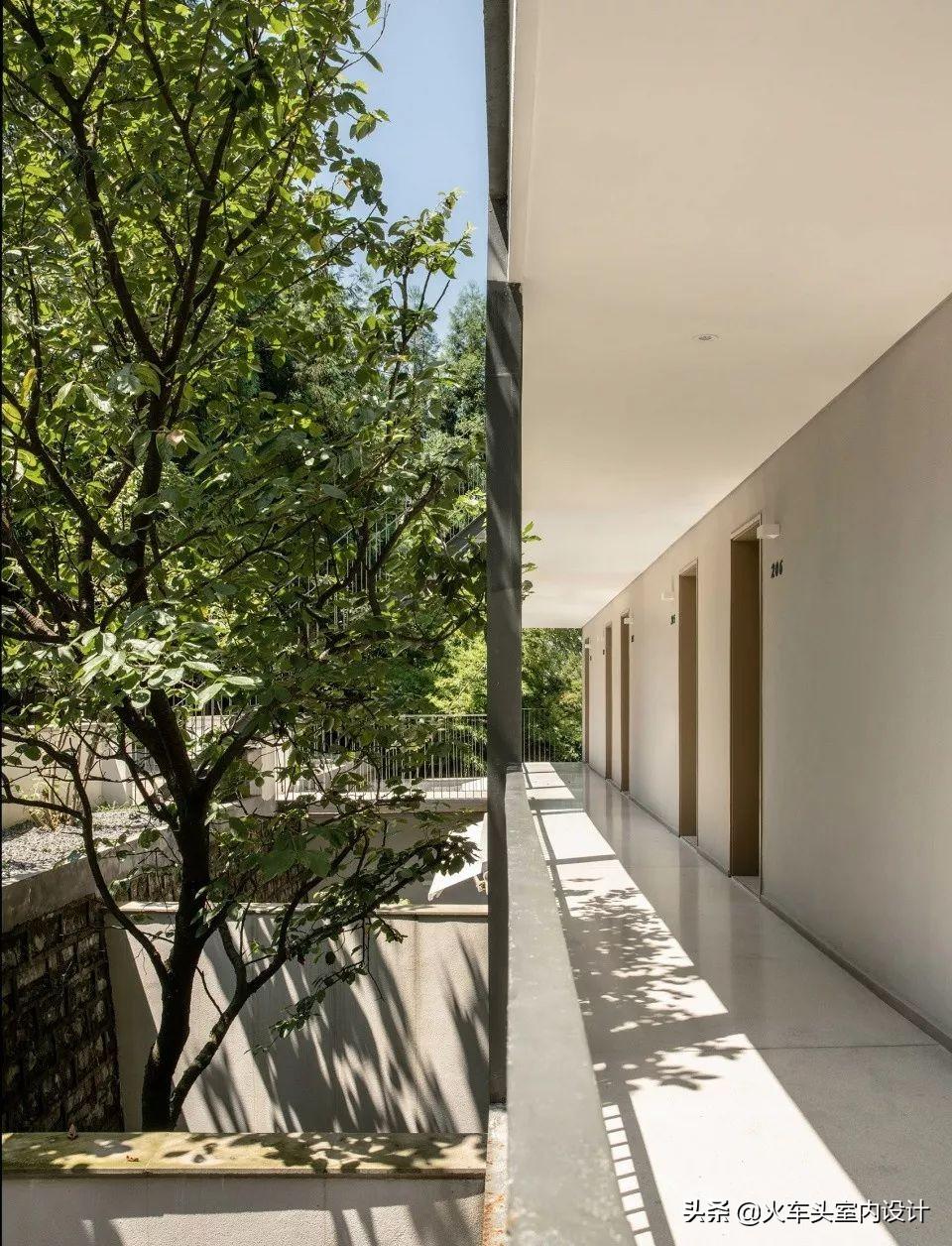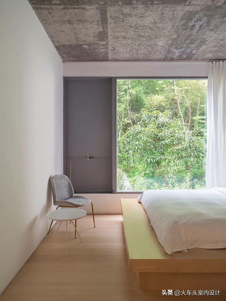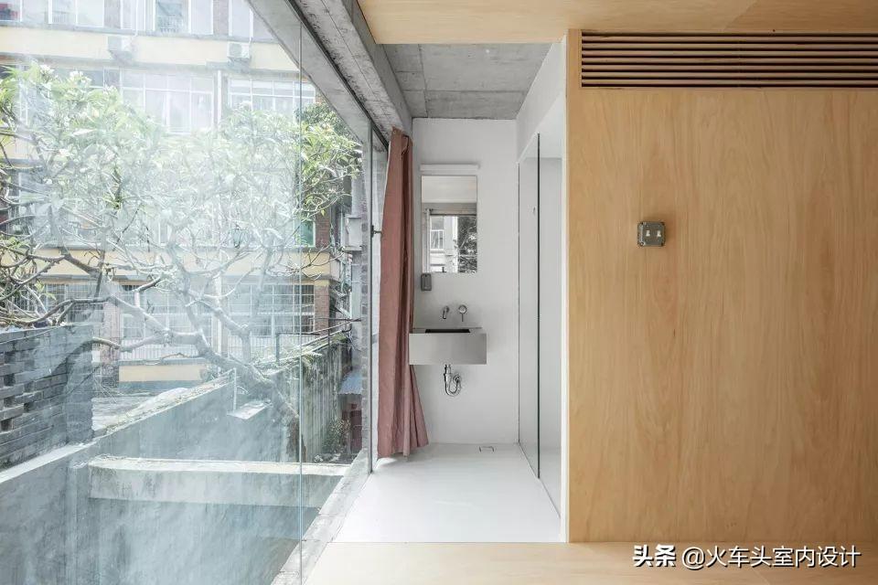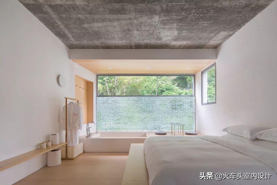 由于主体建筑是砖混结构,房间的规划只能在教室格局上做小心翼翼的拆除和新建,原教室外的宽阔通道变成房间的阳台,配上浴缸与躺椅,面对着柳杉树,可以静静的发呆一整天。