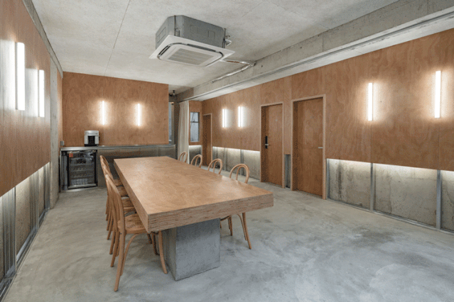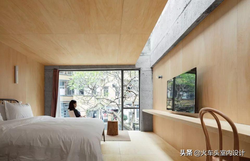 室内原有梁、柱等混凝土结构干净、简单。设计师尝试将原有建筑物的混凝土结构裸露出来作为室内设计的一部分,挑选椴木胶合板作为客房室内的材料,在公共区域则使用了柳桉胶合板来突出混凝土结构。