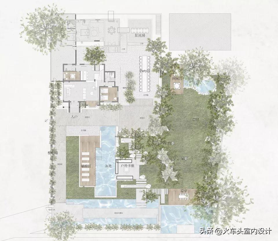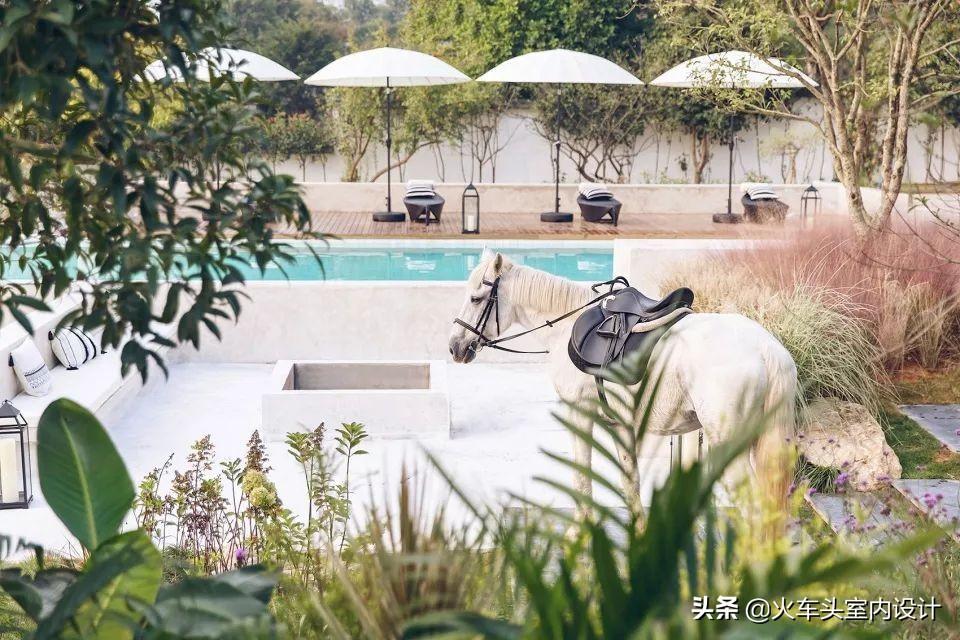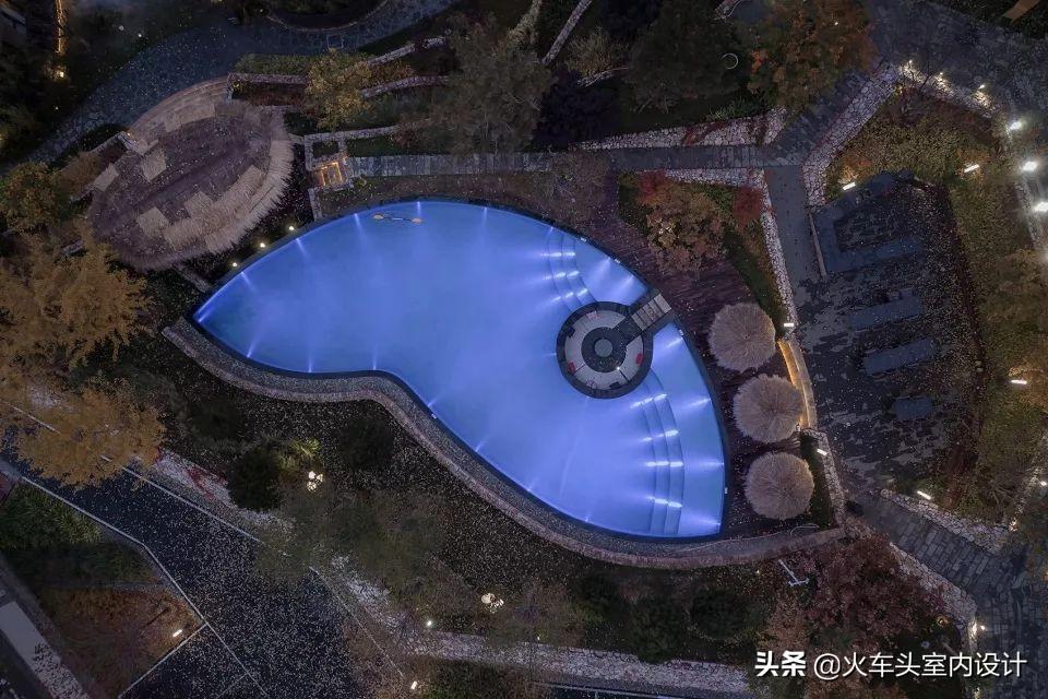 设计师在户外做了北方少有的叶子型室外泳池,与建筑风格相呼应,同时为休闲区平添一丝趣味。