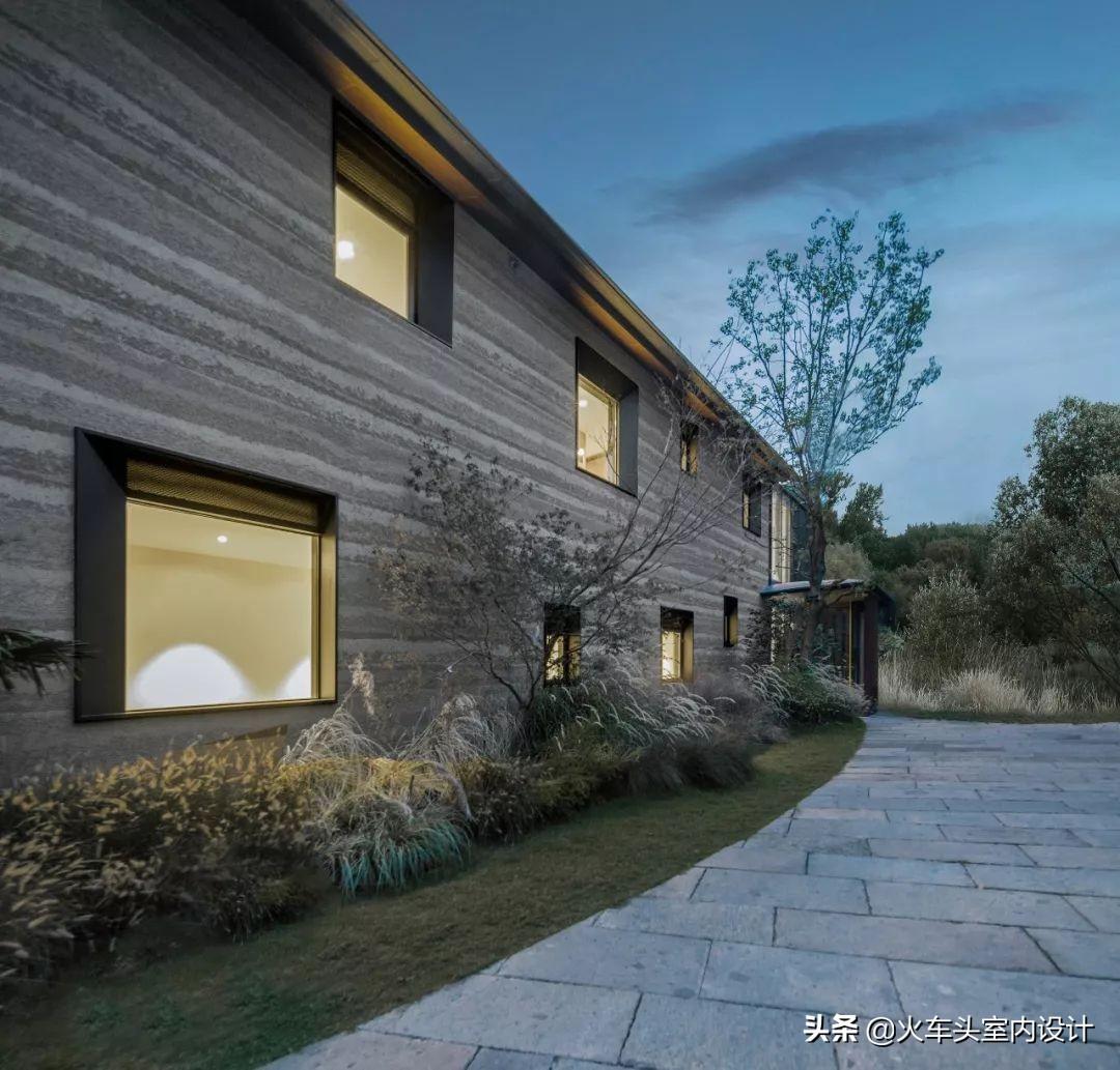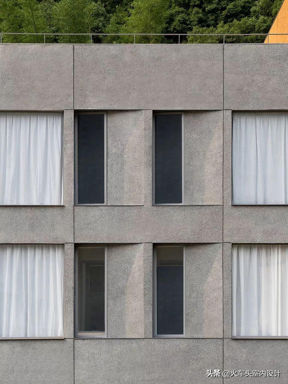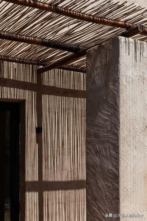 保留建筑室外一部分材料与肌理的向内延伸,外墙夯土肌理漆经过处理,运用在立面装饰上,体现与城市酒店所不同的特殊韵味。