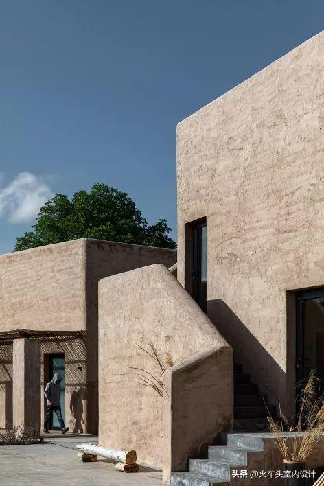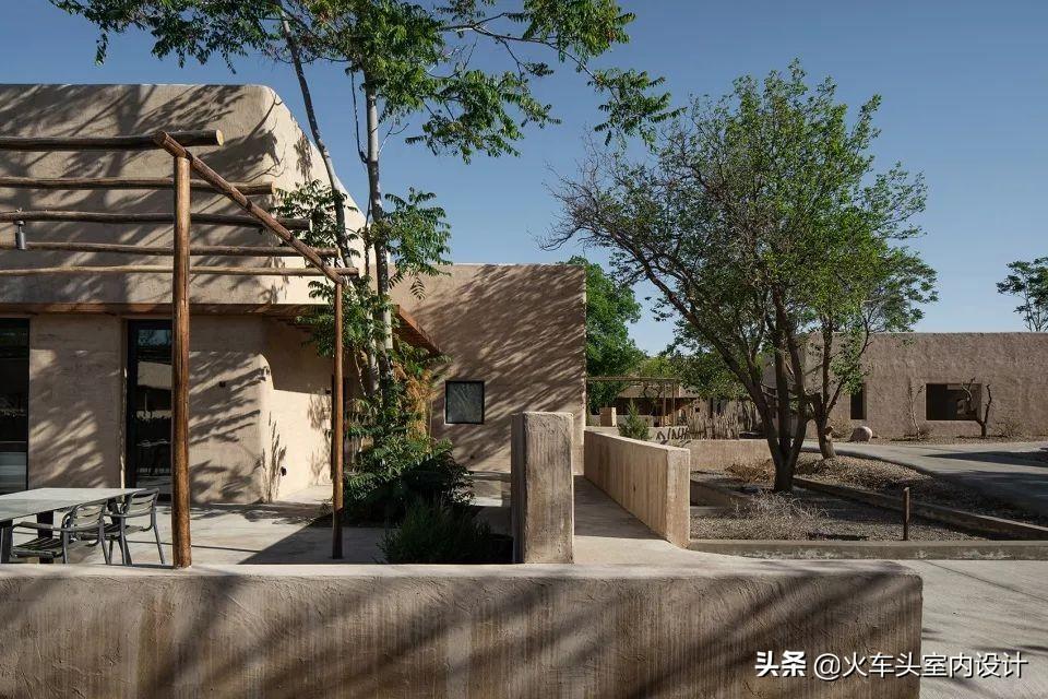 建筑基本遵循当地民居风貌,平屋、露台、院落、苇杆檐廊,将户内活动的更多可能性延伸至户外。在外墙上设计师运用了水泥砂浆抹泥的特殊工艺还原当地夯土墙的建筑肌理。从而创造了似久经风雨日照后,接近却不会崩坏的“旧”。