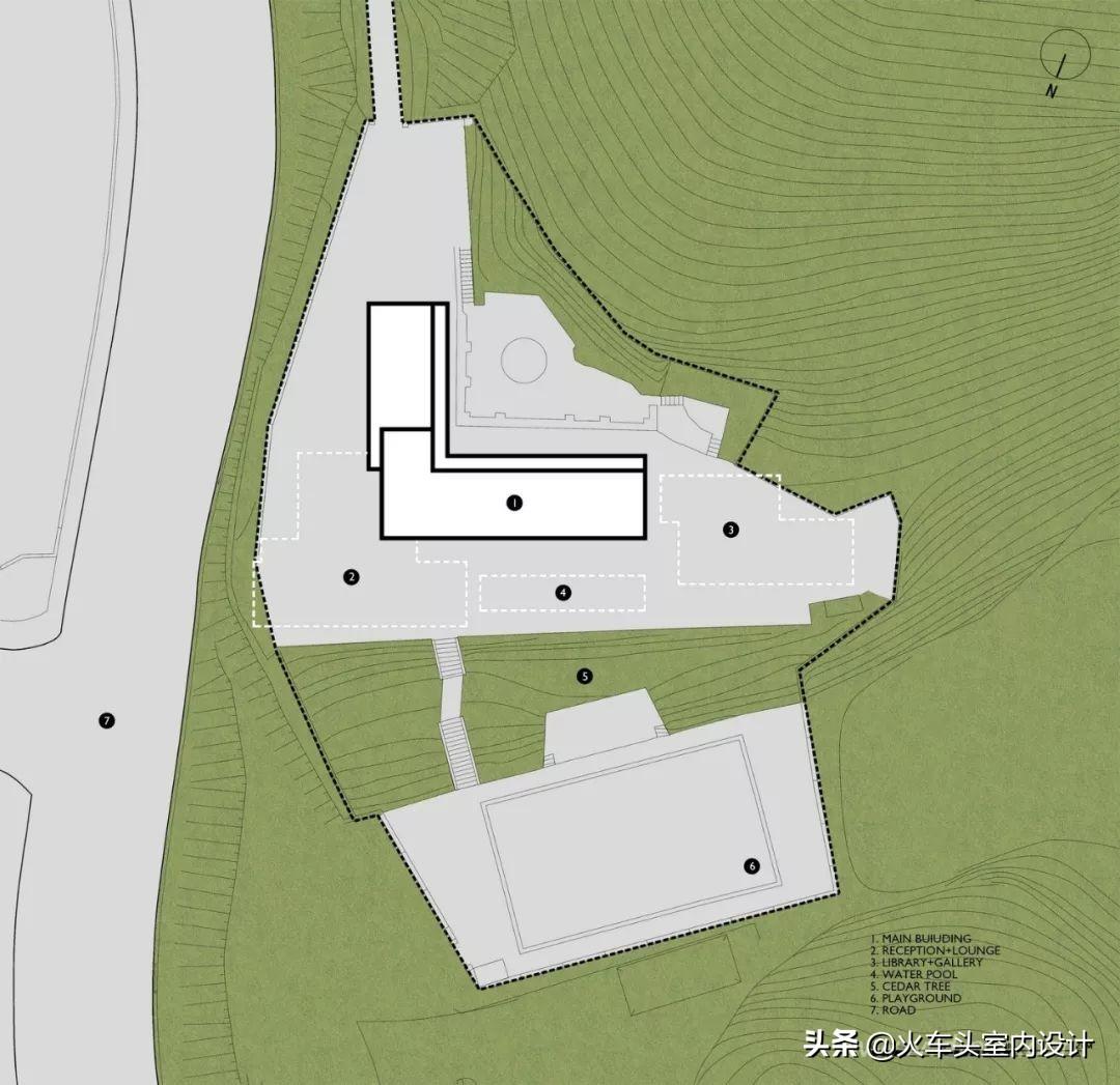 在整体规划设计中,结合场地动静分布的结构,左右两边增加两个功能,分别是酒店客厅及图书馆,而中间的主体建筑,设计则规划了25个房间的住宿功能。