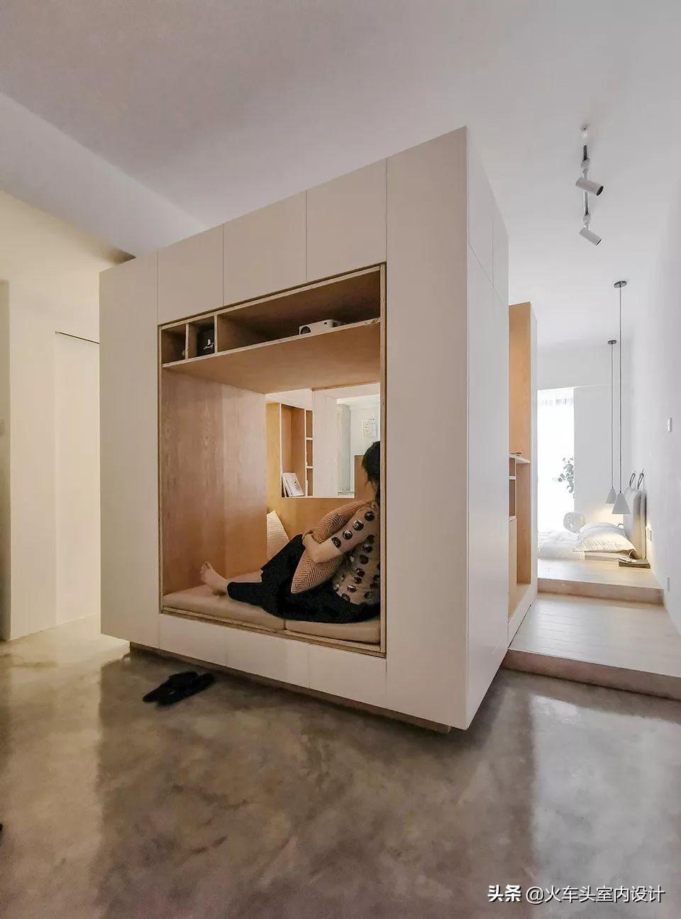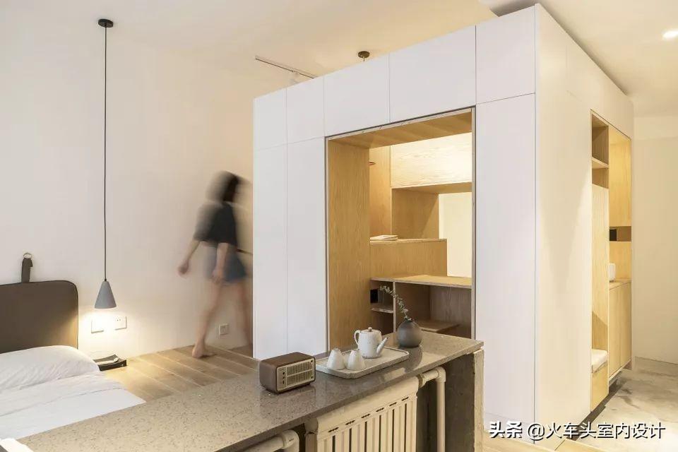 最后,设计团队在靠近入口的位置放置一个完整的经过“掏挖”的家具体量,以达到 “行止相间”的空间目标。
