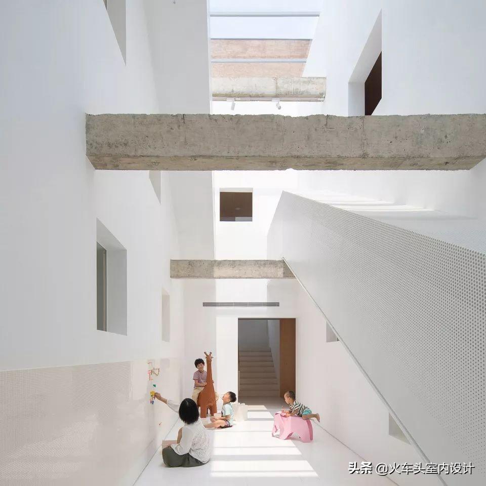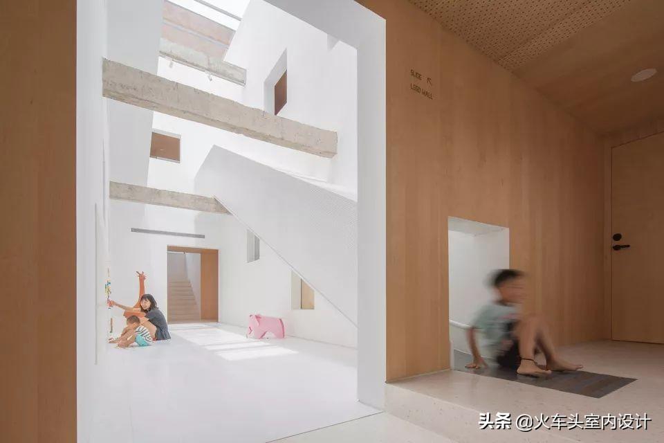 垂直方向增加中庭进行联系,也改变了平面的平铺直叙。借助两组长滑梯,中庭被组织成另一个动态活动中心,孩子和大人都可以快速穿梭在2-4层间,“楼梯间-走廊”构成的固定关系被打破。